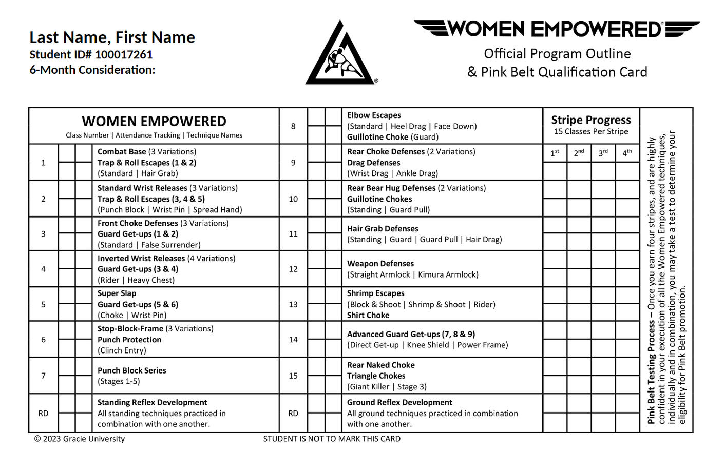 PINK BELT QUALIFICATION CARDYou will be provided your very own Your Women Empowered® Pink Belt Card which will be maintained in the attendance box beside the reception desk.It is an important tool to track the lessons you've attended. The 15 Lessons and Reflex Development classes are marked on your card as you attend them. By completing your card, it will provide both the coaches and yourself guidance on how far along you are in your Women Empowered® journey. It's important to note that 100% completion of the classes, only serves as a pre-requisite for the Women Empowered® Pink Belt examination. The coach and the student will communicate to determine if they are ready for the exam.
